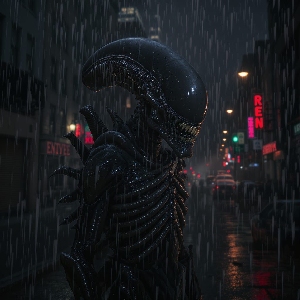 A photorealistic xenomorph figure stands on a New York City street at night. The scene is lit by streetlights and evokes a horror aesthetic with rich, deep colors and cinematic lighting.