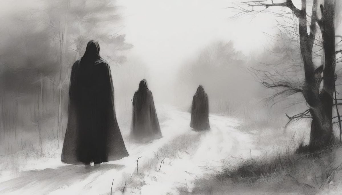This image depicts a lone figure conversing with three spectral figures on a barren winter hilltop during the solstice, rendered in a dynamic ink wash style with gestural brushstrokes and atmospheric effects.