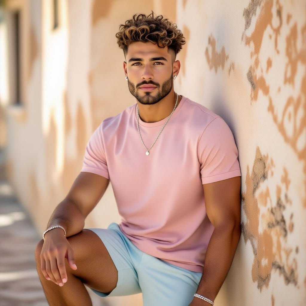 This image shows a man in casual summer attire posing against a textured wall in soft afternoon light. The portrait features a vintage film aesthetic, reminiscent of analog photography.
