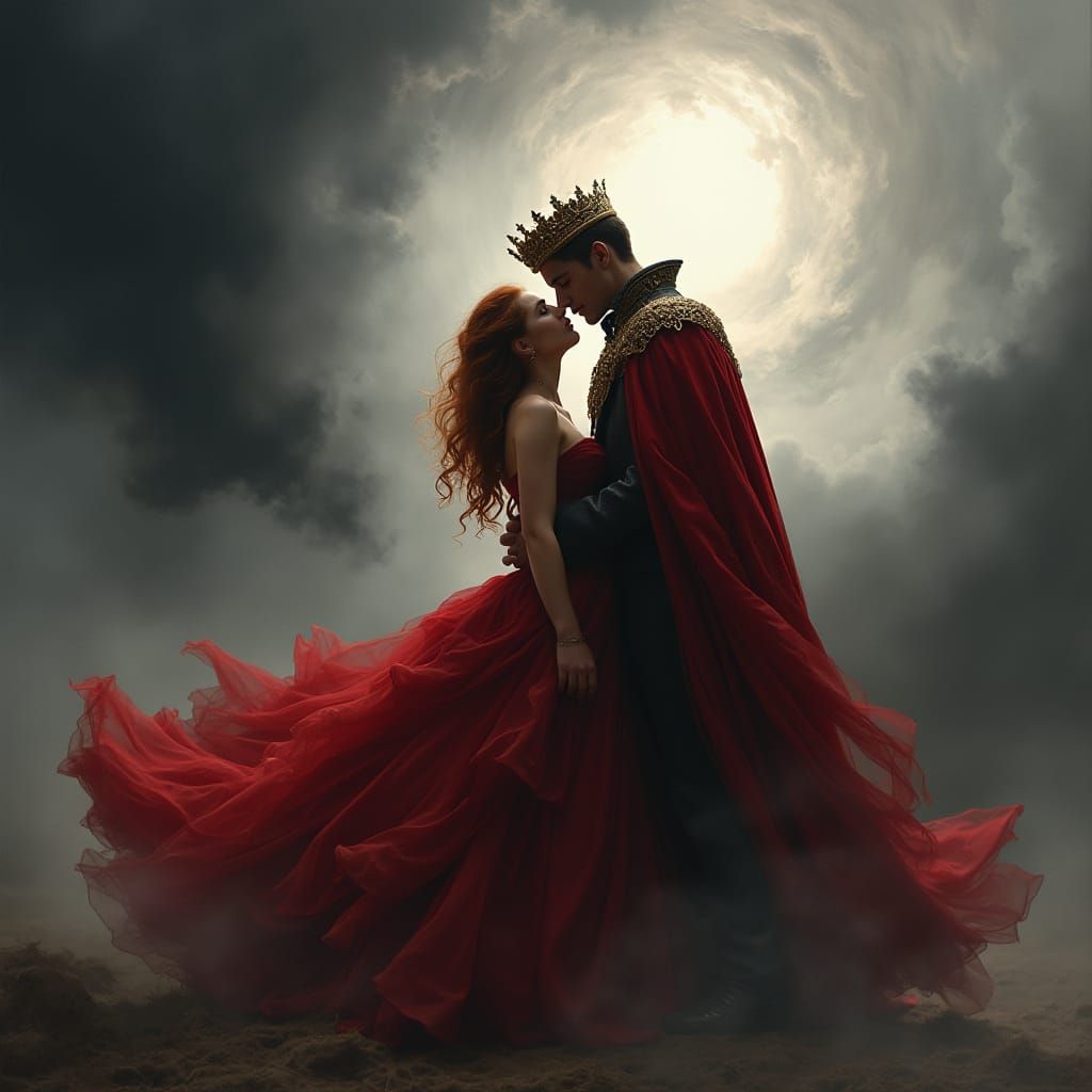 A striking picture of a couple silhouetted against swirling smoke. The woman wears a red gown, and the man a cape and crown. The image is in a dramatic, painterly style with vivid chiaroscuro.
