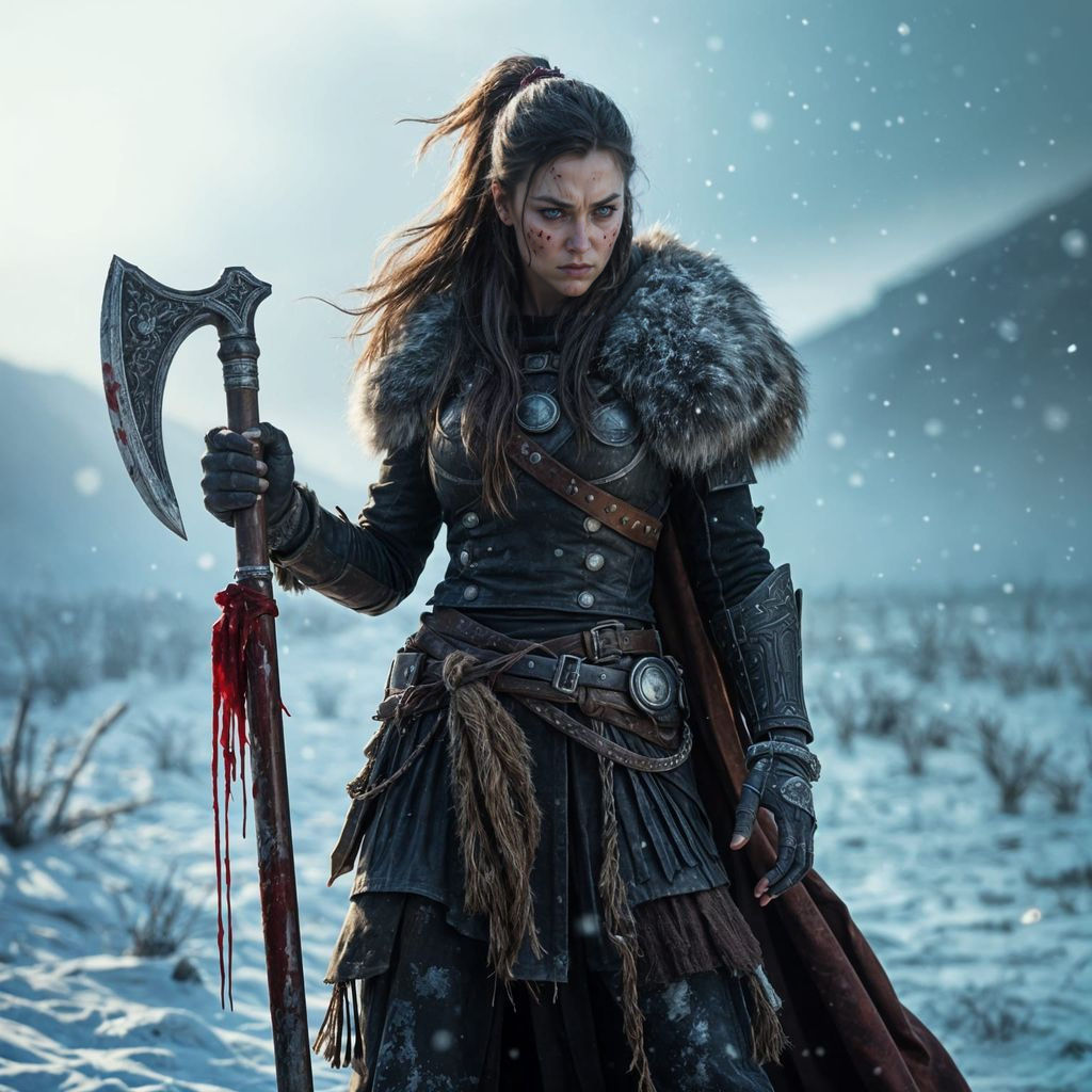 "Digital matte painting. Medium shot. A fierce female viking warrior stands on a snow-covered battlefield, her axe dripping with blood, cinematic lighting, snow falling softly around her, she is battle-worn but defiant. Hyperrealistic rendering, intricate details, volumetric lighting, complementary colors, a masterpiece, 8k resolution, trending on Artstation, Unreal Engine, Alphonse Mucha, Jordan Grimmer, dynamic lighting."