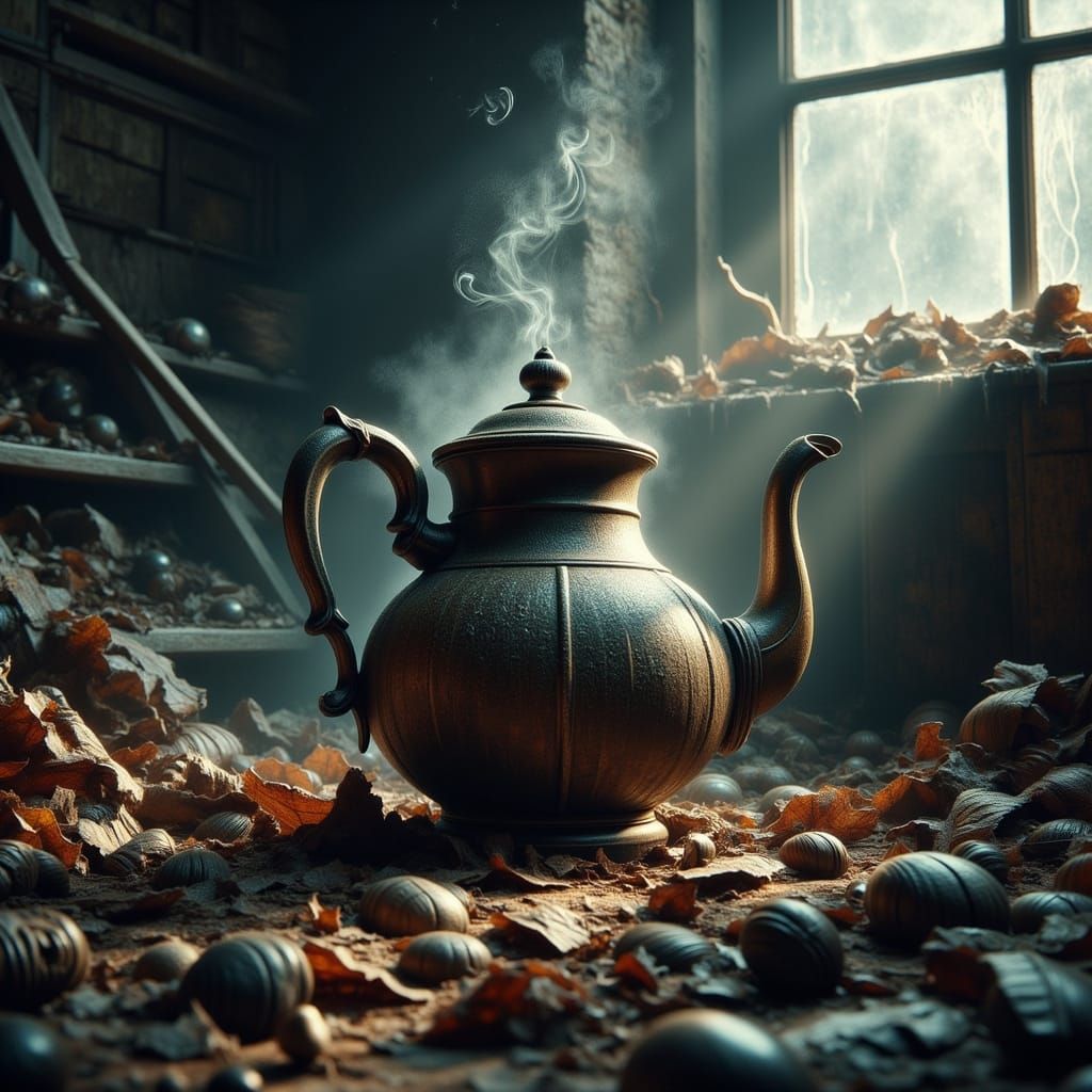 This image shows an ornate, abandoned teapot on a dusty attic floor, illuminated by moonlight. Spectral energy rises from the spout, creating an atmosphere of mystery and melancholy, rendered with photorealistic detail and impressionistic lighting.