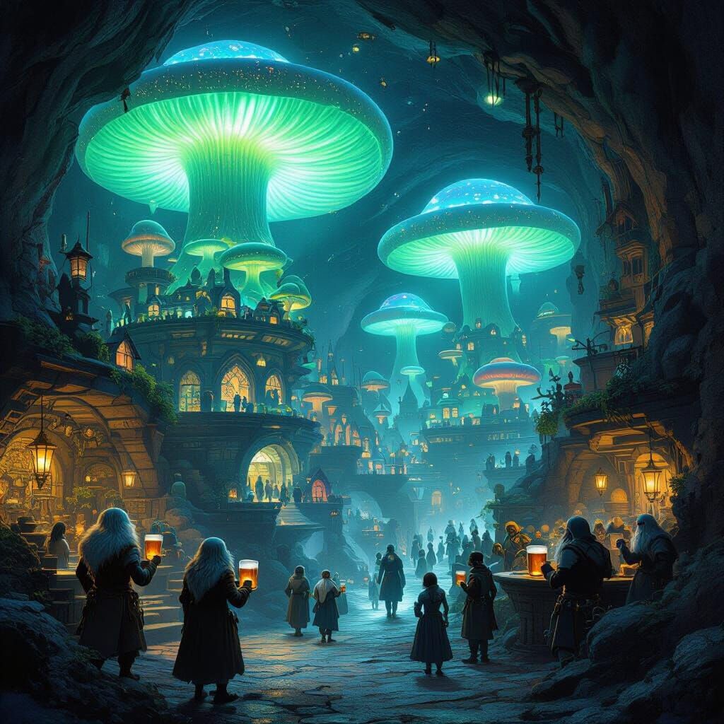 Explore Eckador's subterranean city, lit by glowing fungi. Features mushroom people, villagers with ale, and intricate fantasy concept art with organic architectural elements.