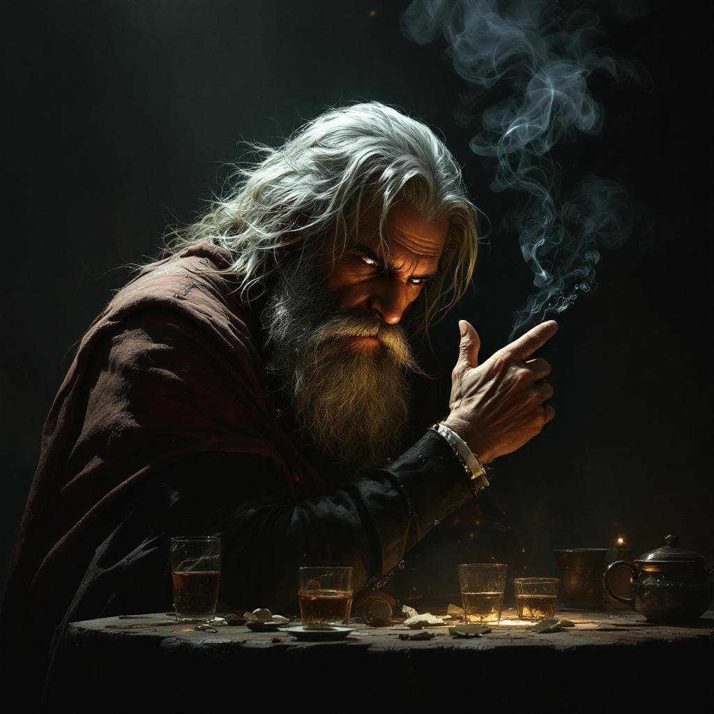 A close-up image of an elderly man with grey hair, wearing a beret and smoking a pipe. The scene is darkly lit, reminiscent of concept art with intricate details and deep colors in a dark, mysterious aesthetic.