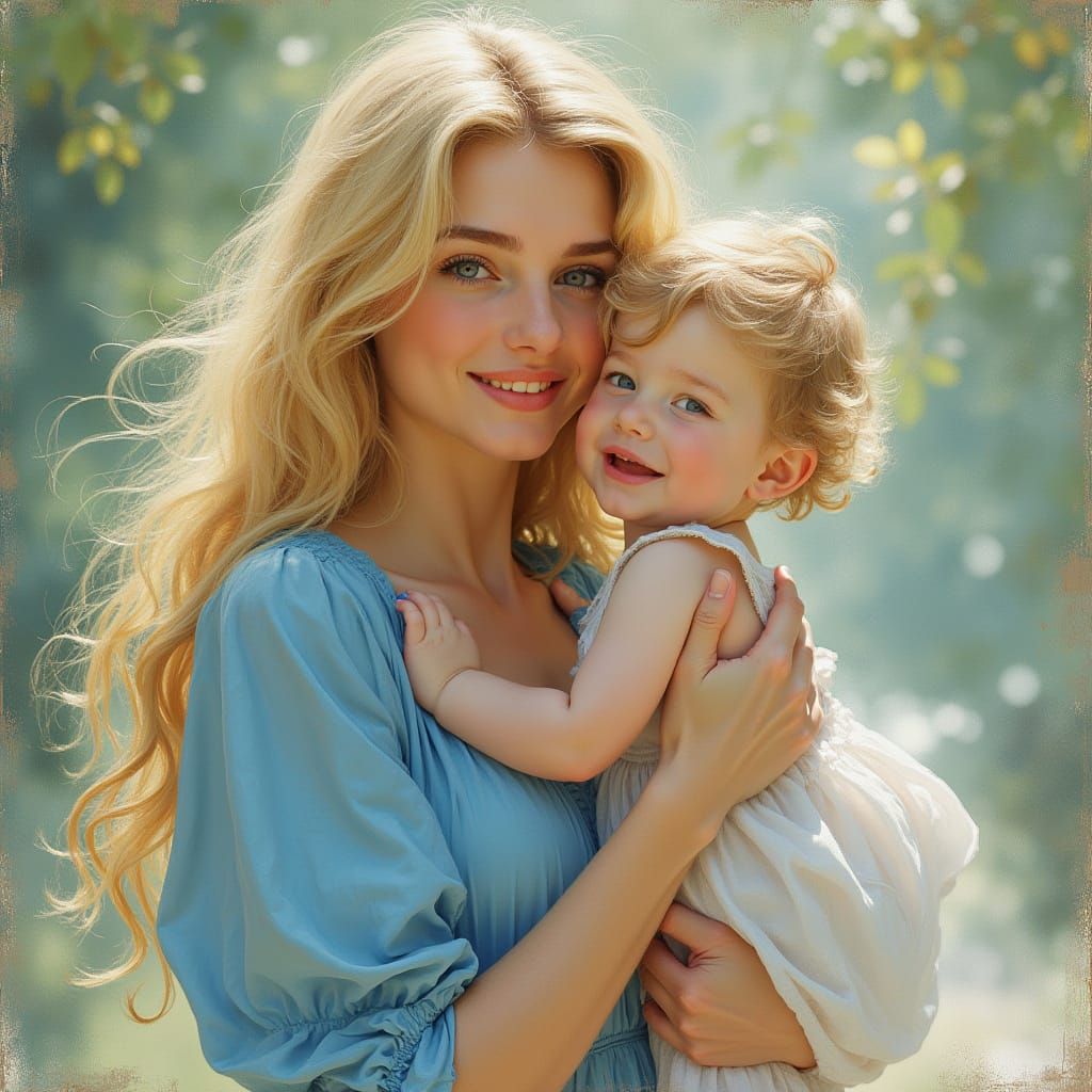This image shows a warm and inviting motherly scene, inspired by the soft brushstrokes of Impressionist masters, with a delicate blue-clad mother cradling her child in a serene and peaceful environment.
