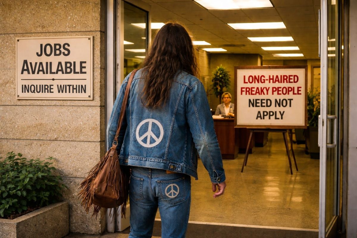 A 1960's hippie with long hair, denim jacket and jeans, with peace symbols patched on, is walking into the foyer of an office building looking for work.