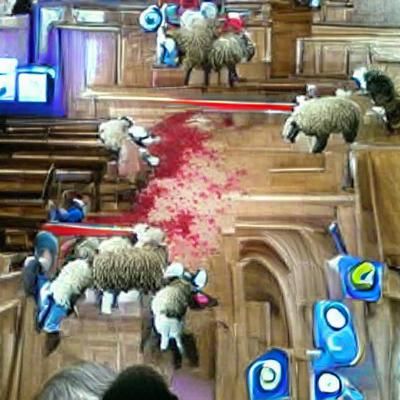 This image depicts the scene an AI created from a simple prompt. It features a disturbing image of sheep being slaughtered inside a church.