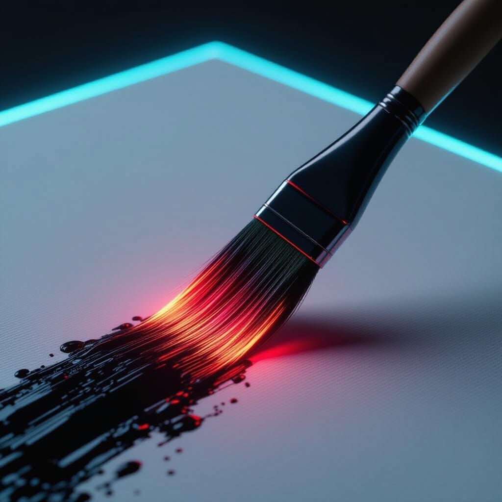 A hyper-minimal, surreal cinematic image of a paintbrush tip glowing with crimson light against a dark background. The color vanishes upon touching the canvas, leaving a gray trail.