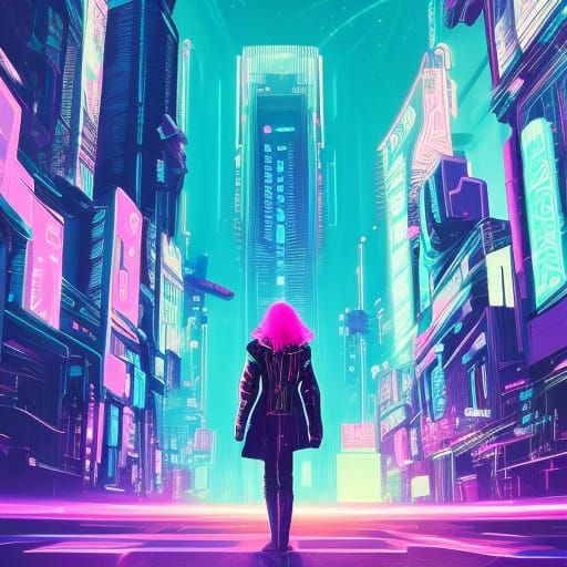 This image shows a celestial woman in a cyberpunk aesthetic, standing in a neon-lit city. Holographic advertisements flicker in the distance, as vibrant colors illuminate the scene in retro-futuristic style.