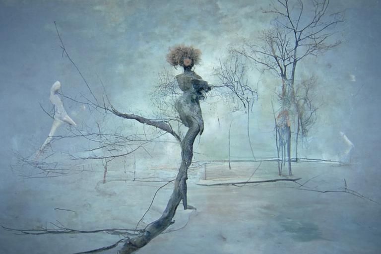 This image depicts a surreal, dreamlike scene of a drawn dancer with elongated limbs. The background dissolves into abstract forms, suggesting ghostly trees and an unraveling path.