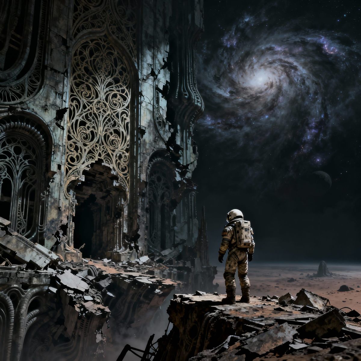 This image shows a lone astronaut surveying vast, crumbling alien ruins on a desolate world. Eerie nebulae fill the sky, rendered with dark fantasy realism and dramatic lighting.