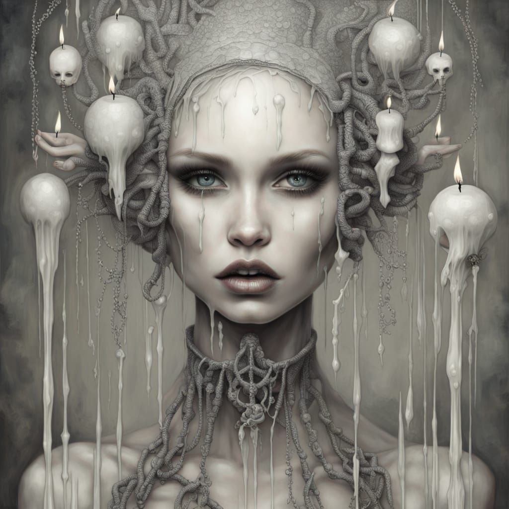 This image features a surreal, monochromatic portrait with unusual proportions and intricate textures, reminiscent of dark fantasy art with dripping wax elements.