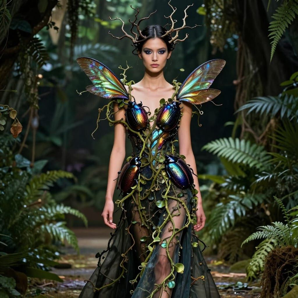 A high-fashion model with unique branch-like hair and obsidian eyes poses in an enchanted jungle. Her gown features beetle wings and vines, in a dark fantasy concept art style.