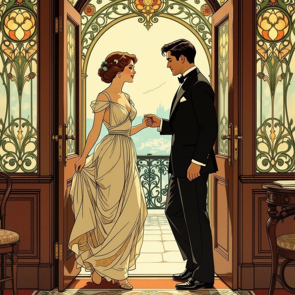 This image depicts a tender moment as a woman enters a room and is greeted with a kiss. The scene is rendered with the ornate details of Art Nouveau and a warm, romantic illustrative style.