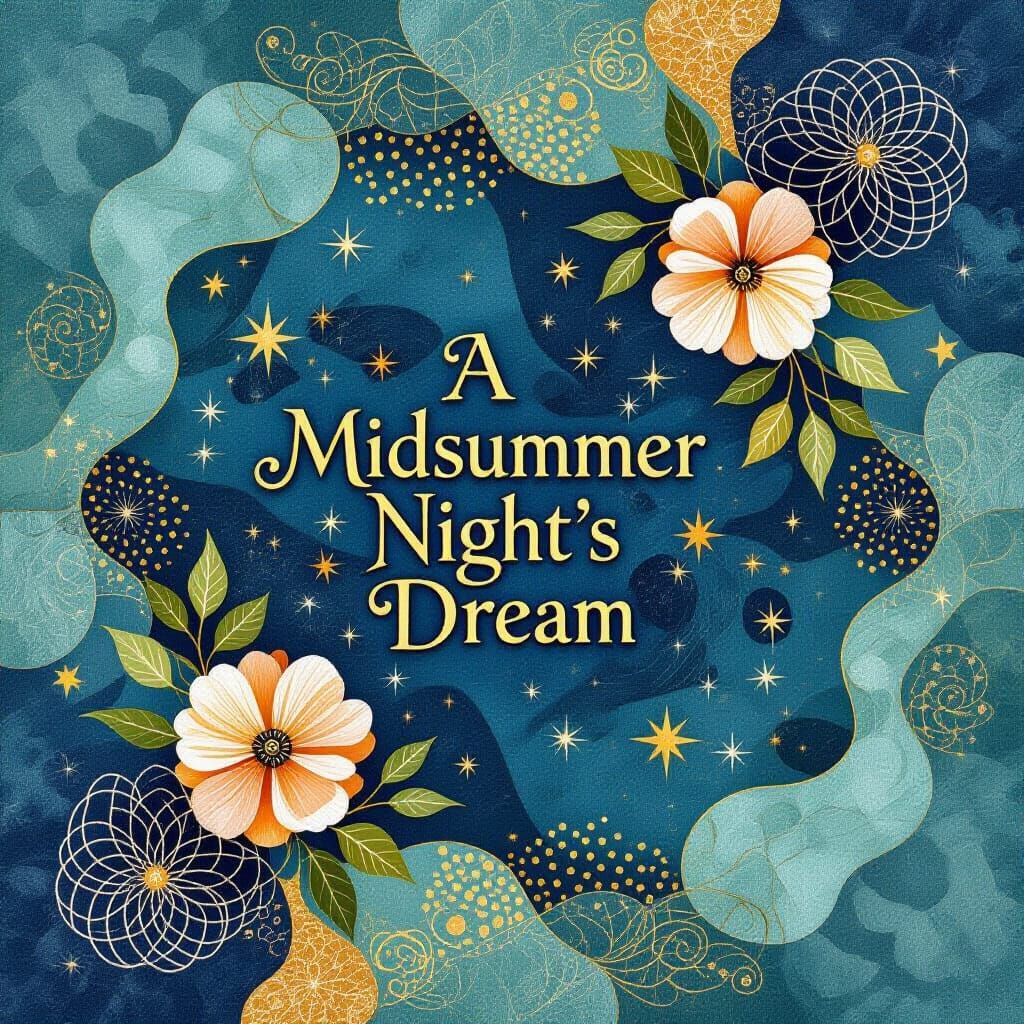 This image shows an abstract digital collage inspired by "A Midsummer Night's Dream". The artwork features layered textures, vivid blues, greens, terracotta, and gold in a fluid composition.