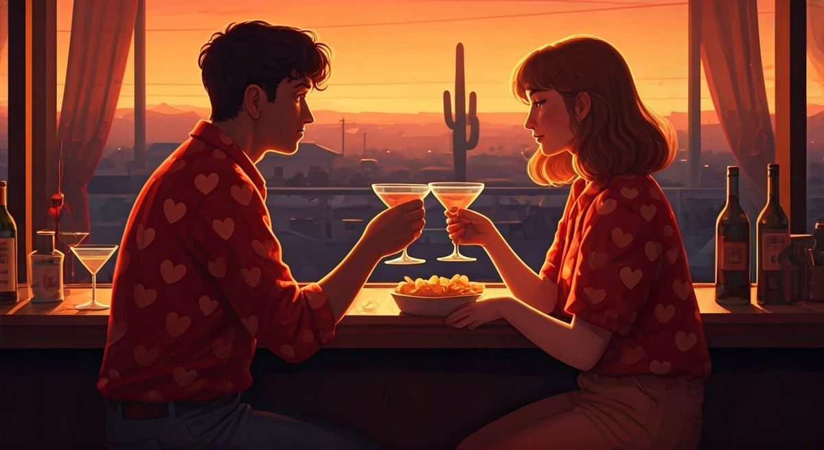 A heartwarming moment of two friends sharing a drink and snacks in a cozy suburban bar, bathed in the warm glow of a desert cityscape at dusk, with a touch of whimsy and nostalgia