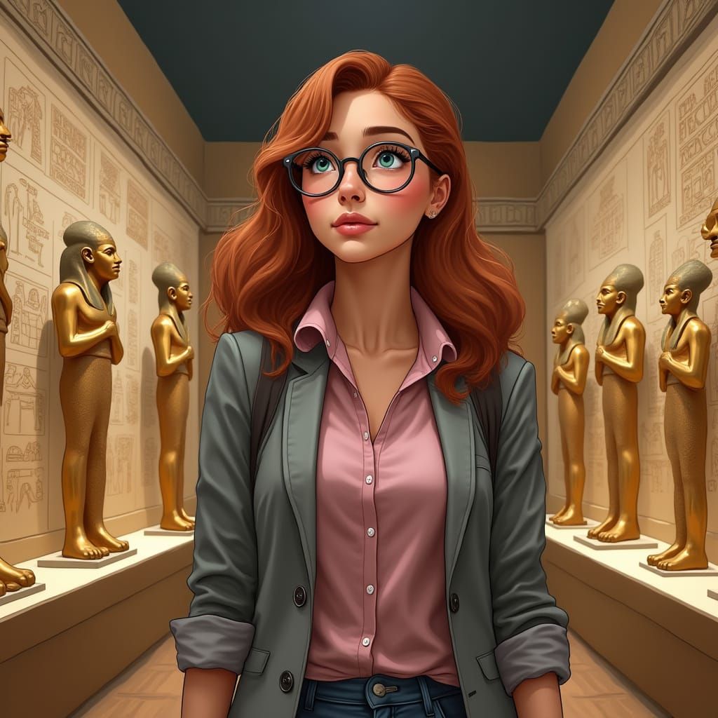 This image shows a young woman with auburn hair and glasses observing an Egyptian exhibit. The photorealistic portrait features detailed textures, capturing a blend of modern and ancient elements.