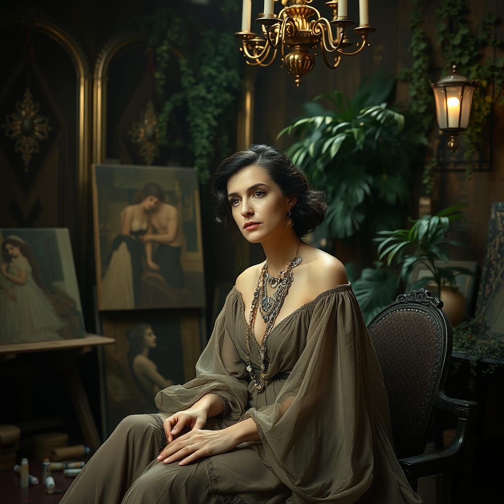 A striking picture of a woman in an elegant gown contemplating in a dimly lit art deco studio. The image evokes a sense of wistful sadness with cinematic lighting and opulent geometric patterns, in the style of a Klimt portrait.