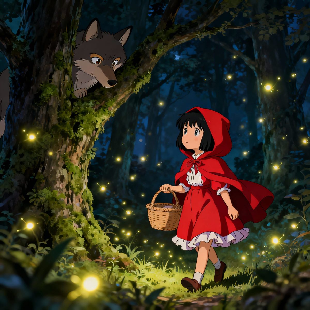 Little Red wanders through an enchanted twilight, where fireflies dance and a curious wolf watches not as predator, but as silent guardian of the tale 🌙🦊❤️😍Bravo!❤️👍