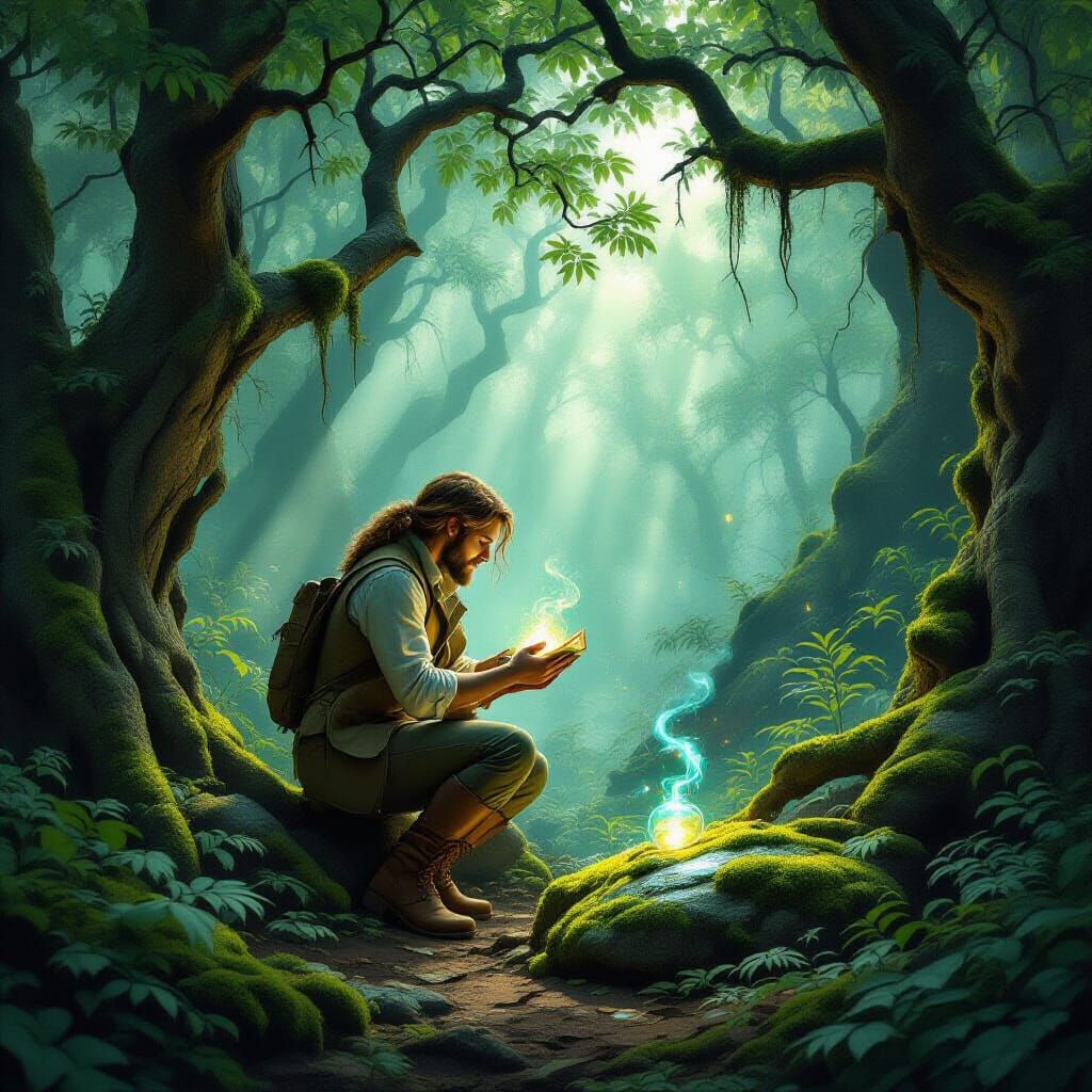 Scientist' secret hobbies of searching wildlife in a hidden forest clearing, surrounded by ancient, gnarled trees. Ethereal motes of light dance in the air. The scene is illuminated by volumetric lighting filtering through the canopy, casting long shadows and highlighting swirling potions. Rendered in ...