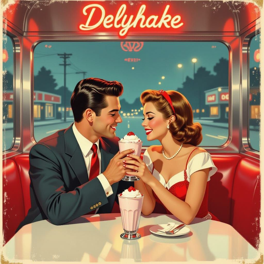 This image captures a nostalgic 1950s diner scene with a couple sharing a milkshake. Rendered in a stylized mid-century illustration style with vibrant colors and warm lighting, evoking innocent romance.