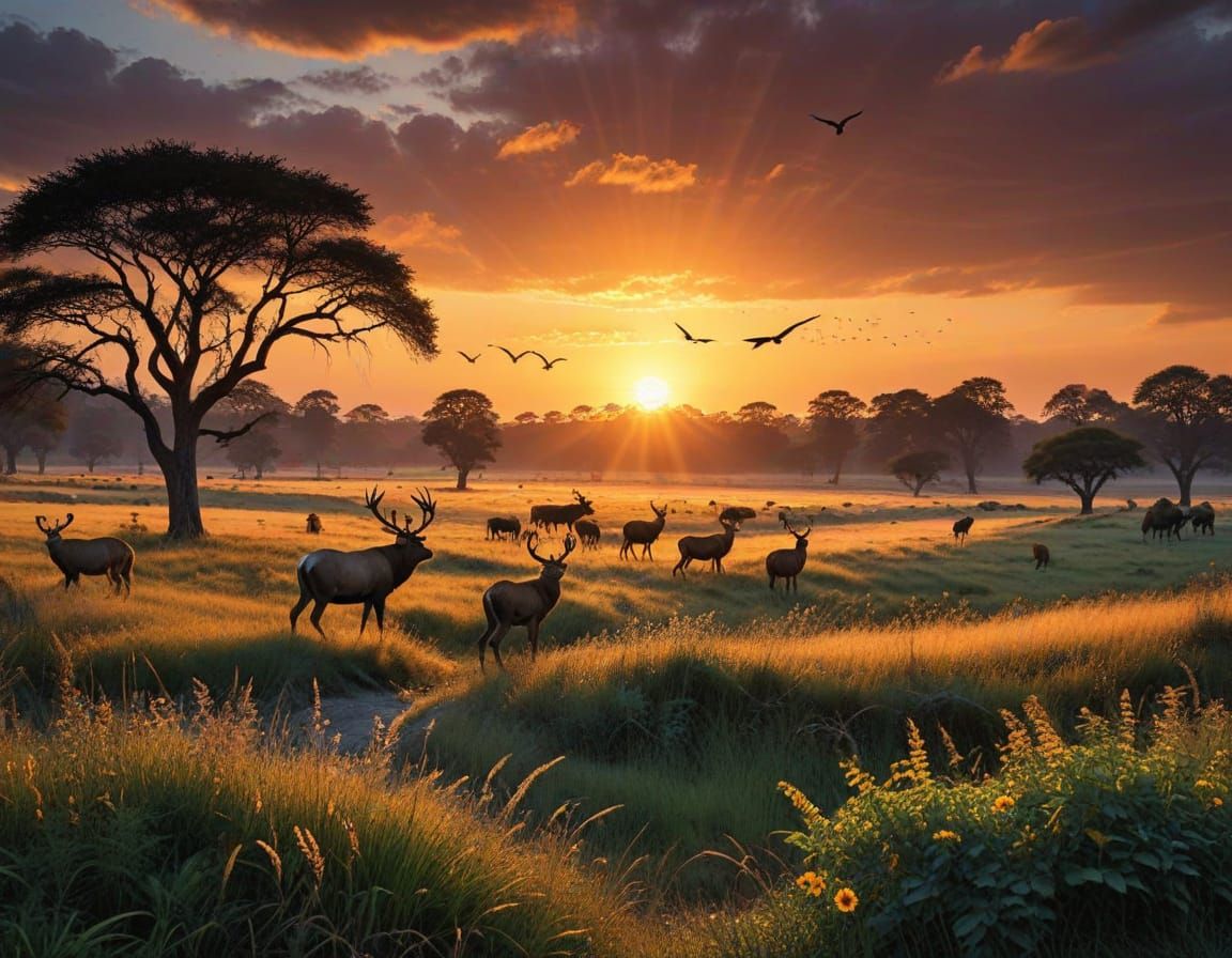 A breathtaking image of a sunset over a vast landscape, teeming with wildlife. The scene evokes a sense of tranquility and natural beauty.