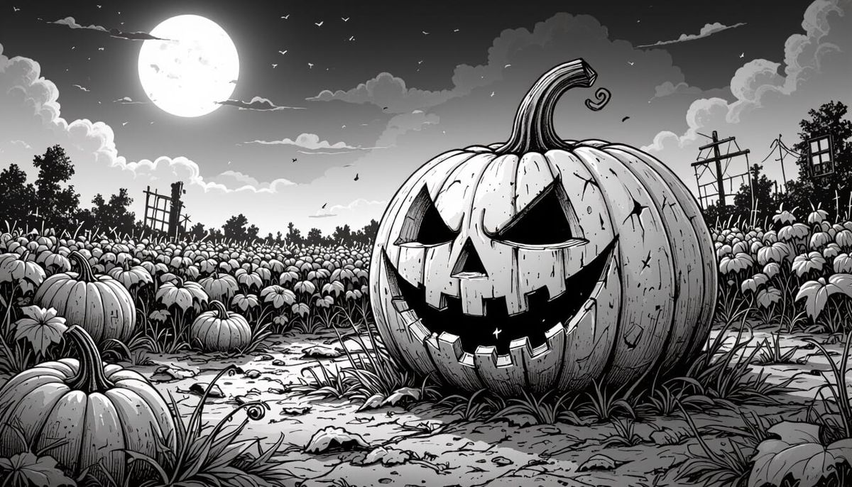 This image depicts a decaying jack-o'-lantern in a moonlit, overgrown pumpkin field. Rendered in a detailed, black and white filigree line art style, it evokes a haunting beauty.