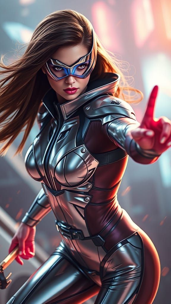 This image shows a dynamic female superhero in a sleek, metallic costume with liquid chrome accents, set against a futuristic backdrop with intense lighting and sharp focus, capturing a cinematic moment of high-octane action.