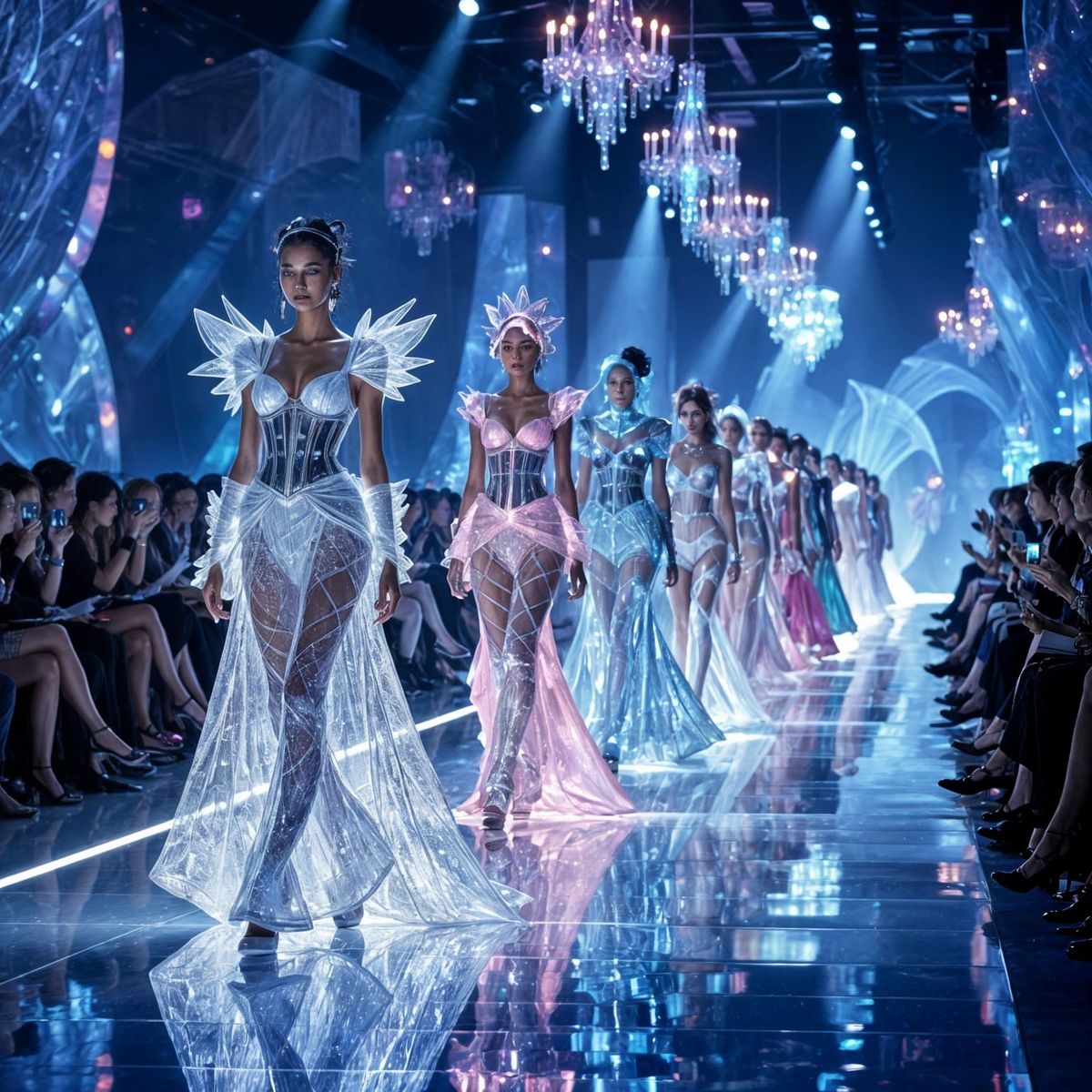 This image depicts a futuristic fashion show featuring models in avant-garde attire crafted from translucent glass, mirrored fabrics, and crystal accessories, all illuminated by neon lights.