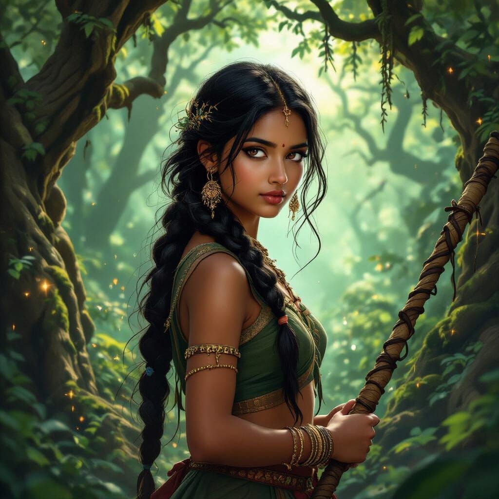 This image shows a young Indian woman embodying the earth element in a mystical, ancient forest. She holds an energy-crackling whip, rendered in a magical fantasy art style with vivid, glowing colors.