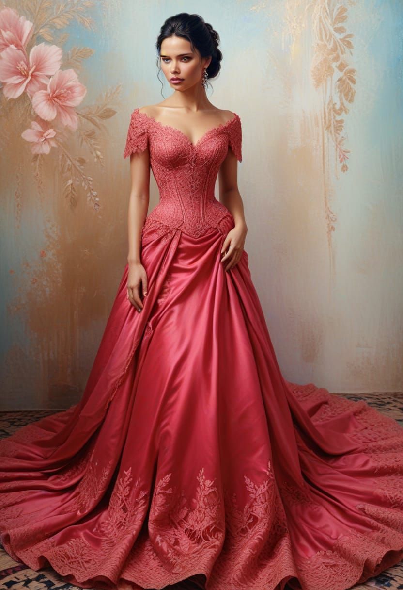 A close-up portrait in the style of an oil painting, depicting a woman in a blue and pink Victorian dress. The artwork features intricate lace details and soft, golden lighting.