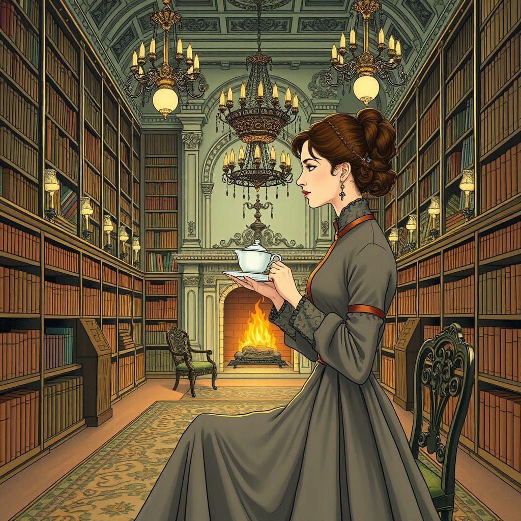 This image shows a refined woman in a beautiful gown enjoying tea within a vast library. The scene features towering bookshelves and ornate chandeliers, rendered with delicate linework and soft, muted colors.