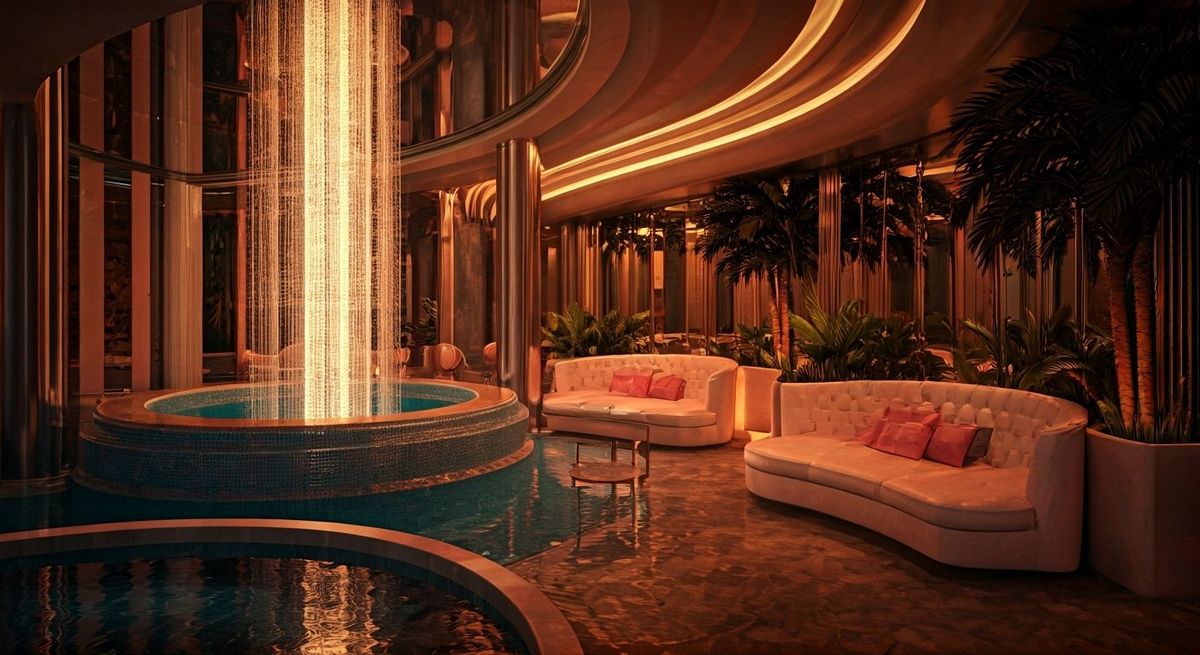 This image shows a luxurious modern interior filled with natural light. Features include a cascading pool, spiral staircase, and a conversation pit with leather sofas, rendered with futuristic curves and retro-futuristic elements.