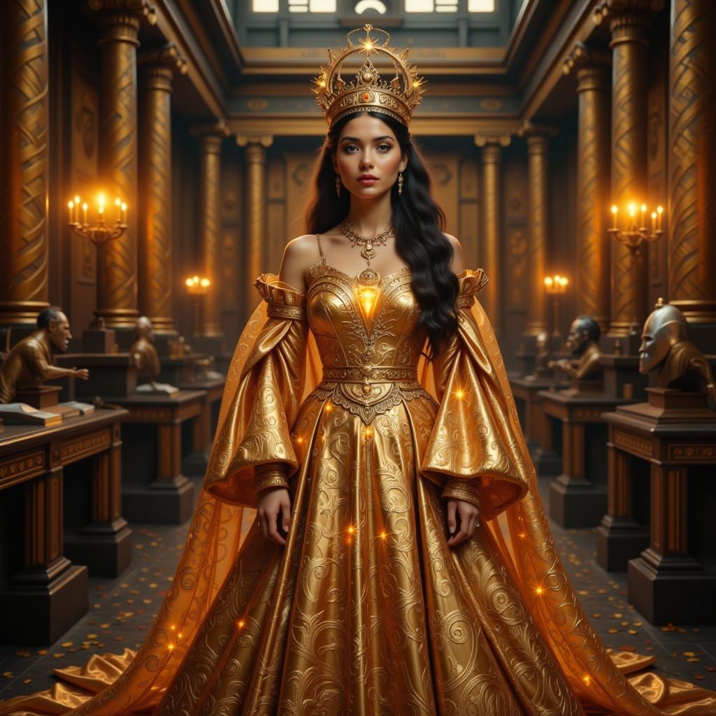 A photorealistic, cinematic portrait of Tsarina Evdokija in a historical hall, surrounded by ornate Siberian artifacts and folklore symbols. The image features vivid, glowing highlights and a sense of hidden magic.