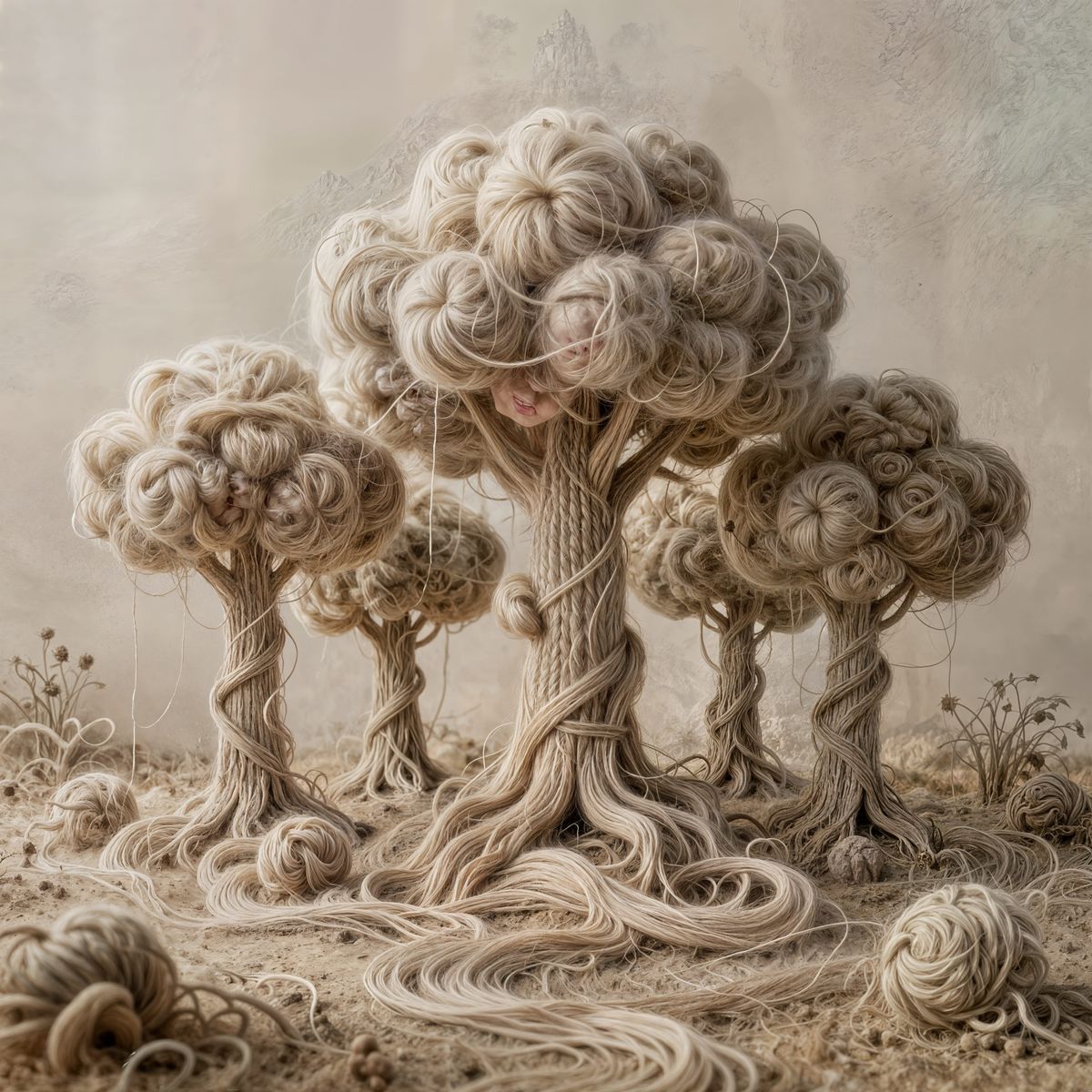 This image shows a fantastical world made of wool and cotton, featuring felt trees and intricate woven clouds. Rendered in deep matte realism with complementary colors, it evokes a trending concept fantasy aesthetic.