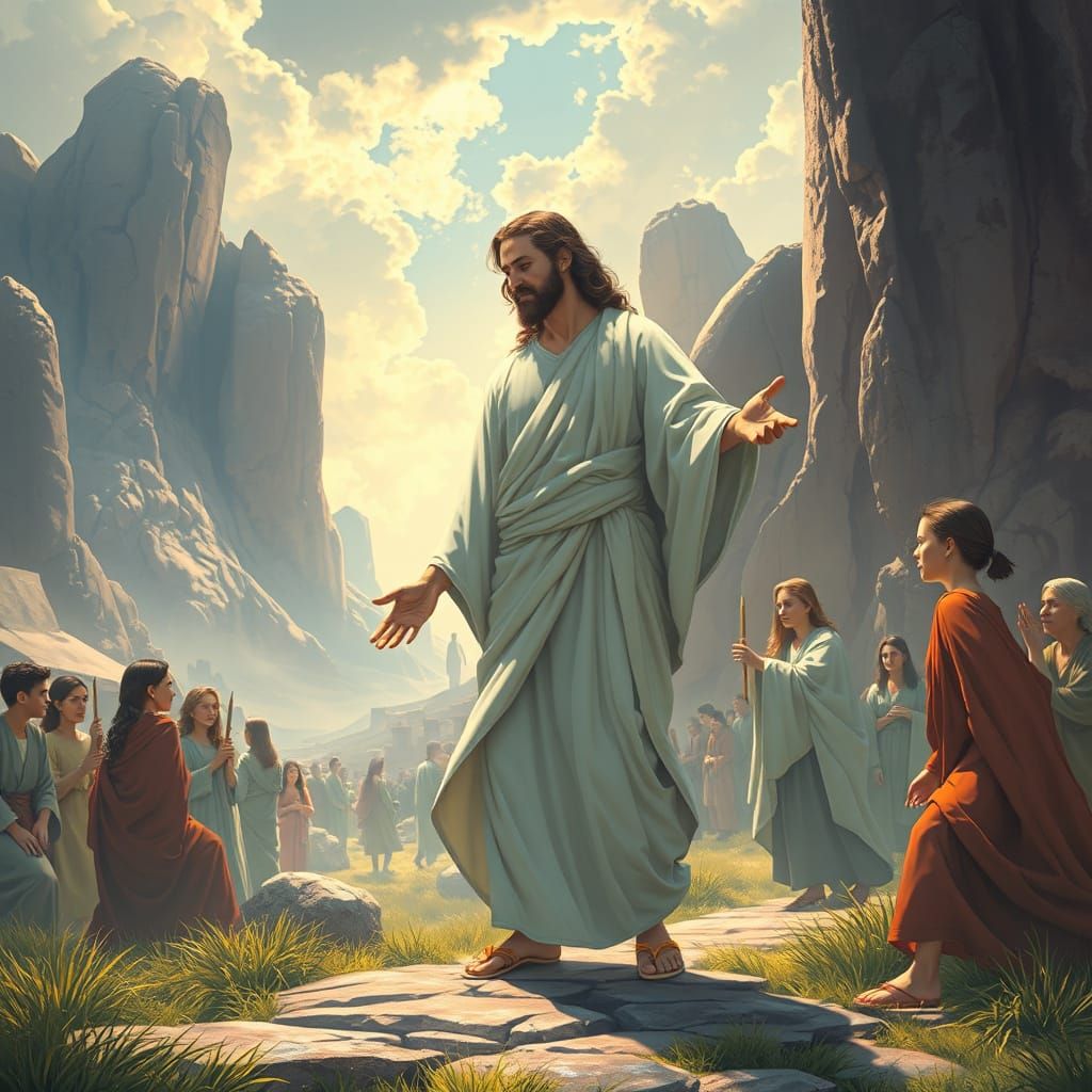 This image depicts a peaceful scene of Jesus helping people in a serene landscape with warm lighting and intricate textures, reminiscent of the styles of Makoto Shinkai and other masters of atmospheric art.