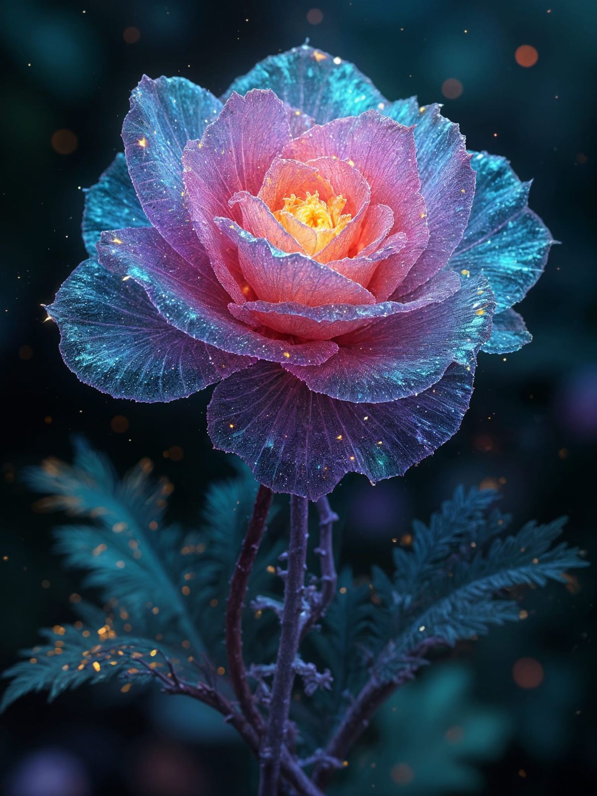 A surreal image of alien roses with crystal petals in electric teal, venom magenta, molten gold, and spectral indigo. The flowers bloom on chrome-black vines around a levitating throne in violet obsidian.