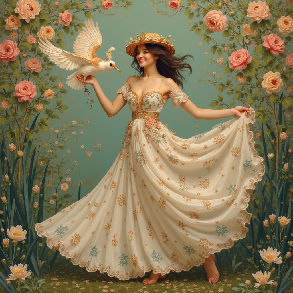 This image depicts a delicate European woman with a radiant aura and joyful smile, dressed in a light silk spring robe with intricate floral patterns, dancing graciously in a lush garden setting surrounded by rose petals and green leaves. She holds a pastel-colored bird with iridescent feathers, evoking ...