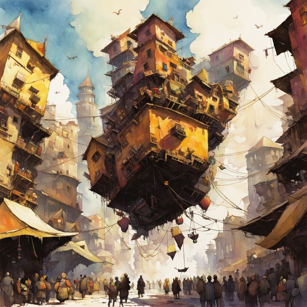 This image shows a bustling bazaar on a sky island, featuring a blurry, shape-shifting street performer. The artwork is a chaotic watercolor fantasy illustration.