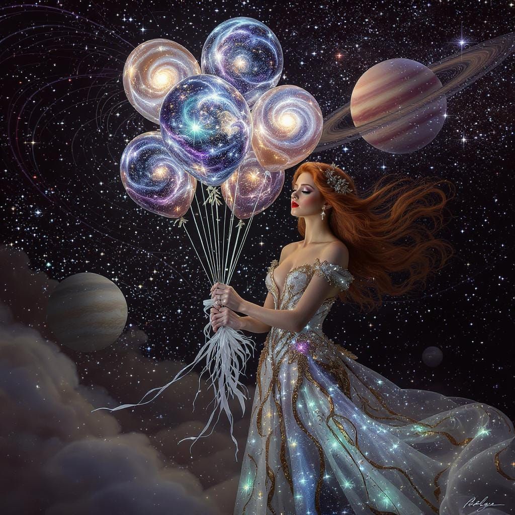 A digital painting shows a red-haired woman in a starlight gown holding celestial balloons, against a cosmic backdrop. The artwork evokes art nouveau with intricate, ethereal details.