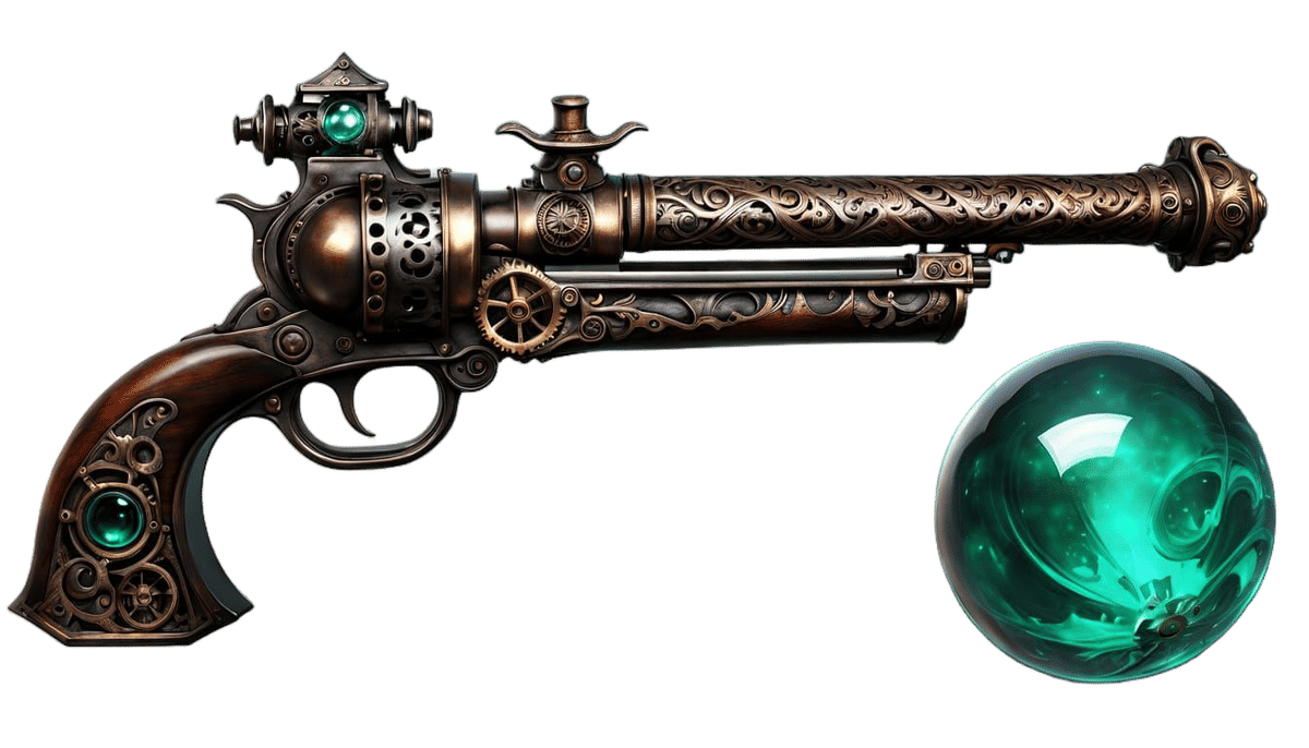 This image shows a fantastical steampunk firearm with intricate details, featuring a unique fusion of iron, wood, and glowing crystals, set against a dark background with vibrant colors and dramatic lighting.