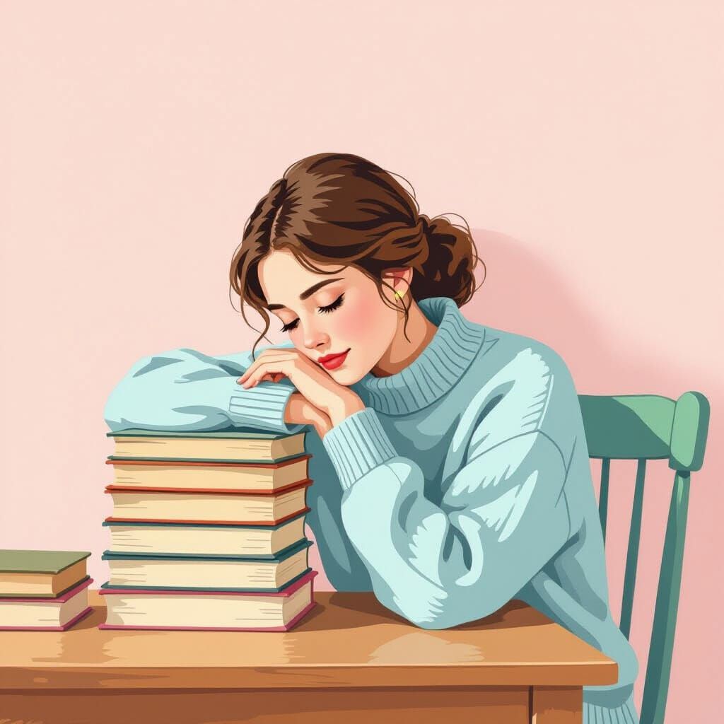 This image shows a young woman asleep at a wooden desk, head resting on books. Soft colors and gentle lighting create a warm, whimsical illustration.