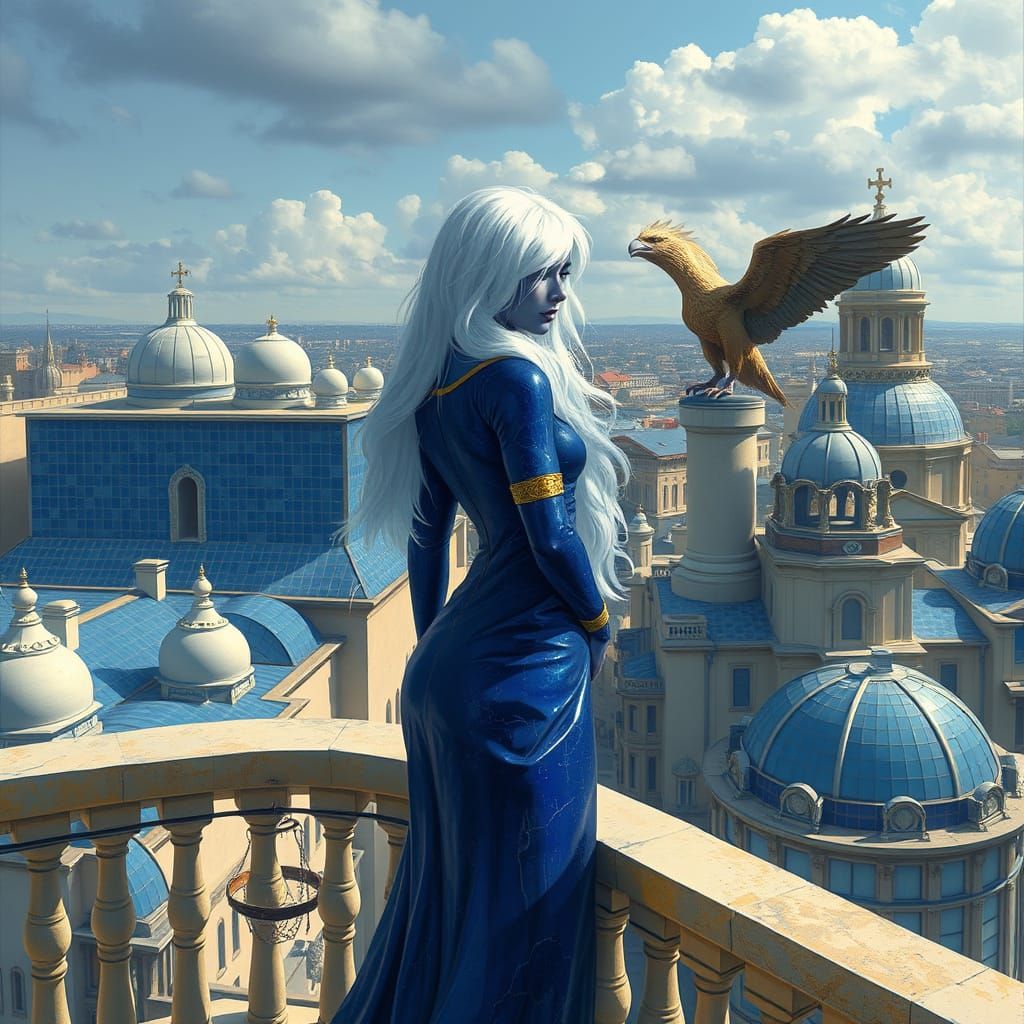 Lapis lazuli dark blue shiny stone lady with golden arm band and white hair on balcony overlooking city with large buildings with shiny blue... Huge bird on a roof.