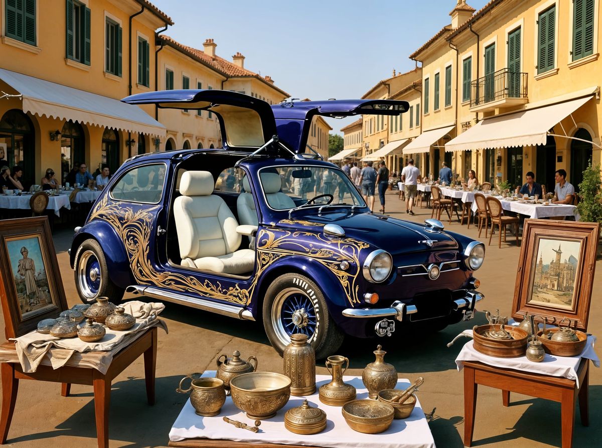 This image depicts a classic Seat 600 gullwing parked in a vibrant Mediterranean market. The scene features antique art objects for sale in a luxurious summer setting.