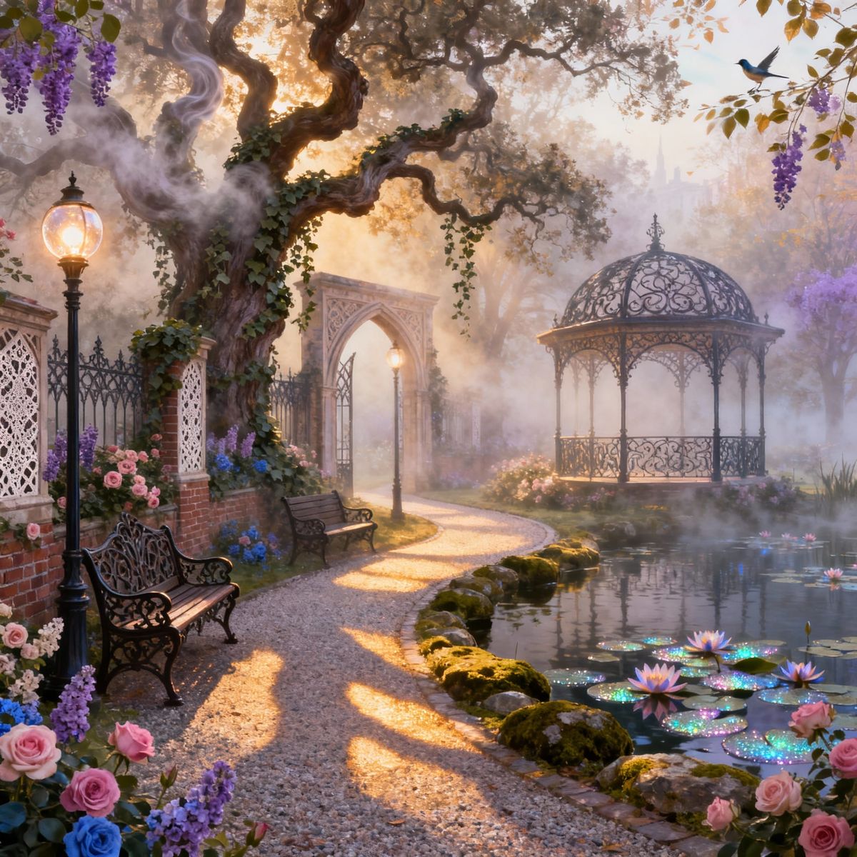 This image captures a Victorian city park enveloped in ethereal, hyperdetailed mist, evoking a sense of fantasy and wonder.