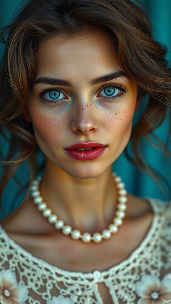 This image shows a hyperrealistic portrait of a freckled woman with wavy brown hair, blue eyes, and a pearl necklace. The soft natural lighting and blurred teal background evoke photorealism.
