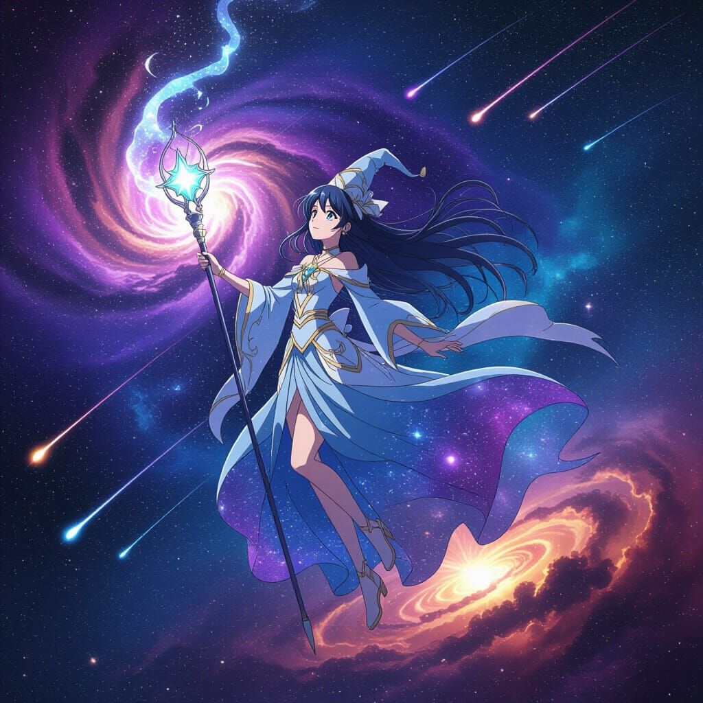This image shows an anime sorceress floating in space with a galaxy in her staff. She wears a cosmic dress glowing with stardust, depicted in vivid colors and ethereal lighting.