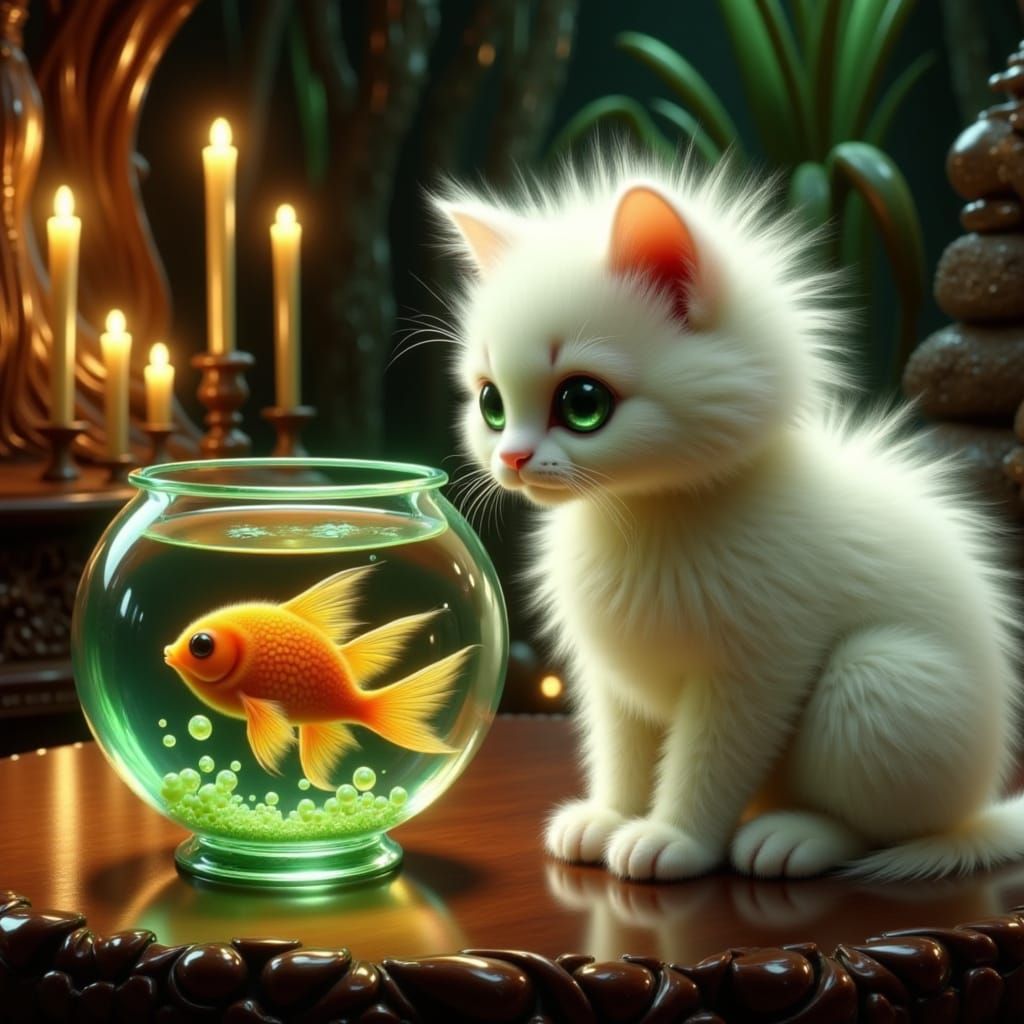 This hyperrealistic digital painting showcases a fluffy white Persian cat observing a goldfish in a clear bowl. Warm tones contrast with cool blues and greens, featuring detailed volumetric lighting.