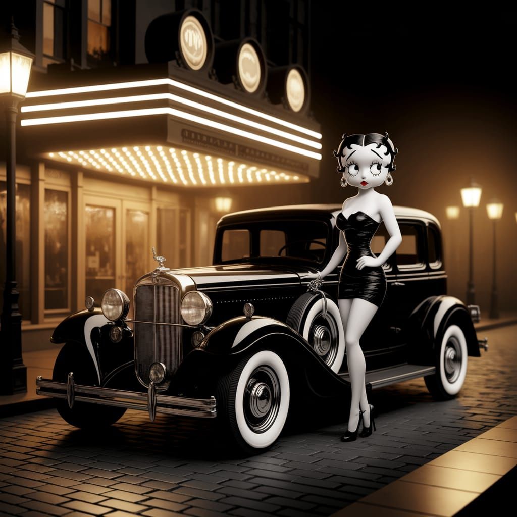 This image depicts a charming black and white scene of Betty Boop standing next to a 1930 car in front of an Art Deco nightclub, set in a vintage 1930s street with warm golden lighting and cobblestone pavement.