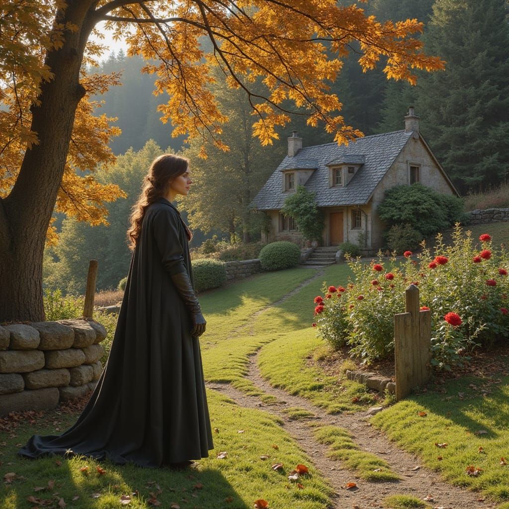 This image depicts a serene woman in a rose garden surrounded by autumn foliage, evoking a sense of nostalgia and wistfulness, in a classical, romantic style with rich colors and soft brushstrokes.